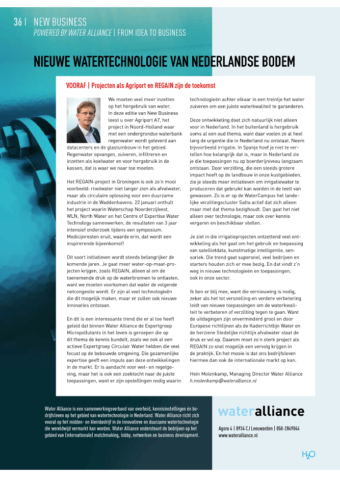 Ik ben er blij mee, want die vernieuwing is nodig, zeker als het tot versnelling en verdere verbetering leidt van nieuwe toepassingen om de waterkwaliteit te verbeteren of verzilting tegen te gaan. Want de uitdagingen zijn onverminderd groot en door Europese richtlijnen als de Kaderrichtlijn Water en de herziene Stedelijke richtlijn afvalwater staat de druk er vol op. Daarom moet zo’n sterk project als REGAIN zo snel mogelijk een vervolg krijgen in de praktijk. En het mooie is dat ons bedrijfsleven hiermee ook aan de internationale markt kan.